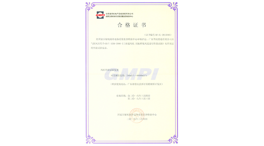 廣東肇慶德通有限公司實(shí)驗(yàn)室持續(xù)符合GB/T1236-2000《工業(yè)通風(fēng)機(jī) 用標(biāo)準(zhǔn)化風(fēng)道進(jìn)行性能試驗(yàn)》的標(biāo)準(zhǔn)規(guī)定的性能試驗(yàn)要求,續(xù)頒合格證書(shū)!...