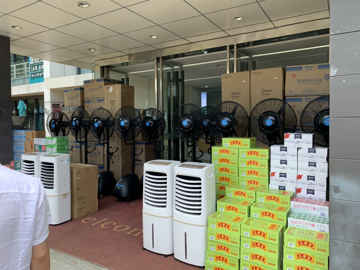 廣州正值炎夏,白天氣溫可達30℃+,為解決戶外悶熱問題,一批德通霧化降溫風扇使用于抗疫一線,為醫護人員及民眾帶來絲絲清涼。